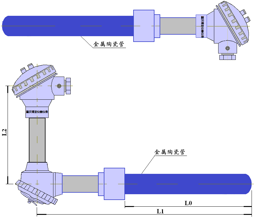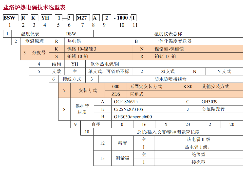 熔鹽液體特別是在強電場的作用下,對浸入式熱電偶金屬外套管具有極強的腐蝕性,一般的高溫合金都很快被腐蝕,而陶瓷套管的致密性很差,鹽液容易滲透進去,對 熱電偶偶絲造成腐蝕。BSWR□YH 鹽浴爐專用熱電偶,采用陶瓷和特種金屬混合體特制的一種金屬陶瓷管,此種金屬陶瓷管耐低、中、高溫熔鹽液腐蝕,抗熱震性好, 高使用溫度 1280℃,可靠性高,使用壽命長。在 1280℃ 的熔鹽中連續試驗 1000 小時不開裂,在 1280℃至室溫急 冷急熱循環試驗 60 次不開裂,是目前耐鹽液腐蝕的好材料,已成功應用于熱處理行業高溫鹽浴爐的溫度連續測 量,效果非常好。由于金屬陶瓷管采用粉末壓裝成型,再在高溫下燒結成型,故目前的尺寸只有φ23 ×300 和φ23×400。整支熱電偶采用裝配形式組裝而成,偶芯可拆卸取出,以滿足不同公司的工藝要 求定期效驗。